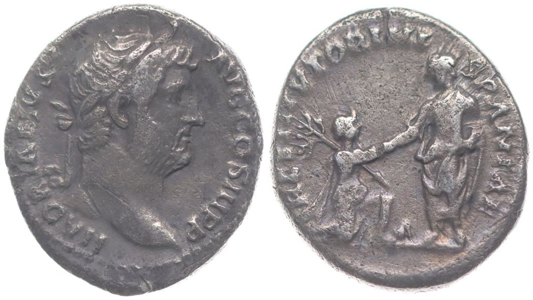 AR Denár, Rv:"RESTITVTOR.HISPANIAE.", císař a klečící Hispánie, S.996pod, K.32.99, RIC.326f