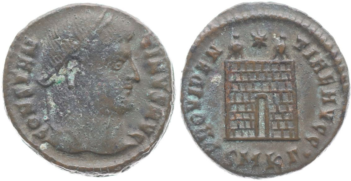 AE3, Rv:"PROVIDENTIAE.AVGG.", táborová brána, minc.Cyzicus S.3778, C.454, K.145.40, RIC.58