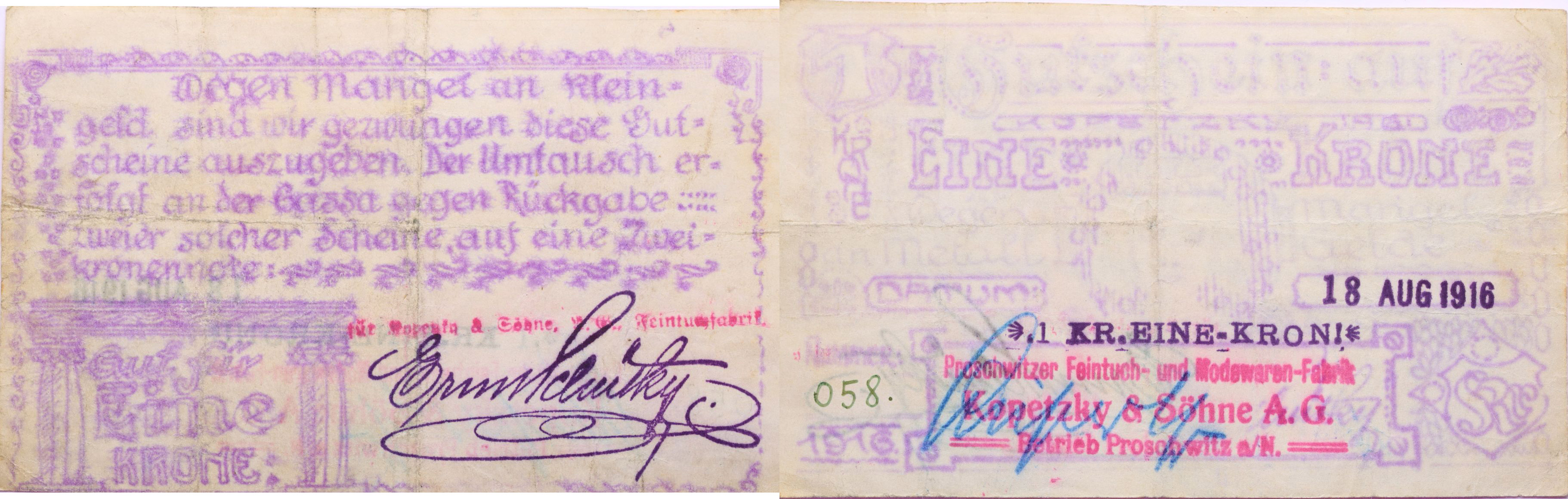 Proseč nad Nisou (Proschwitz a.Neisse) Kopetzky&Söhne.A.G. 1 K.-18.8.1916, č.058, DH.168.1.1
