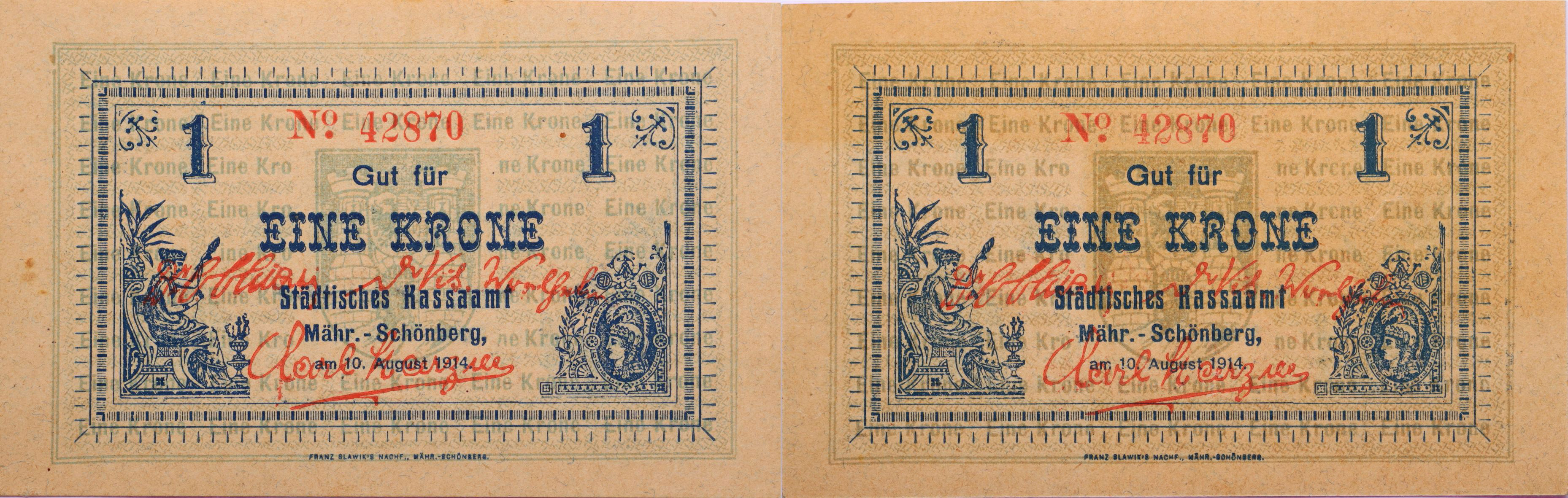 Šumperk (M.Schönberg) město, 1 Krone 10.8.1914, č.42870 DH.120.1.2b_u okraje 3x hnědá skvrnka