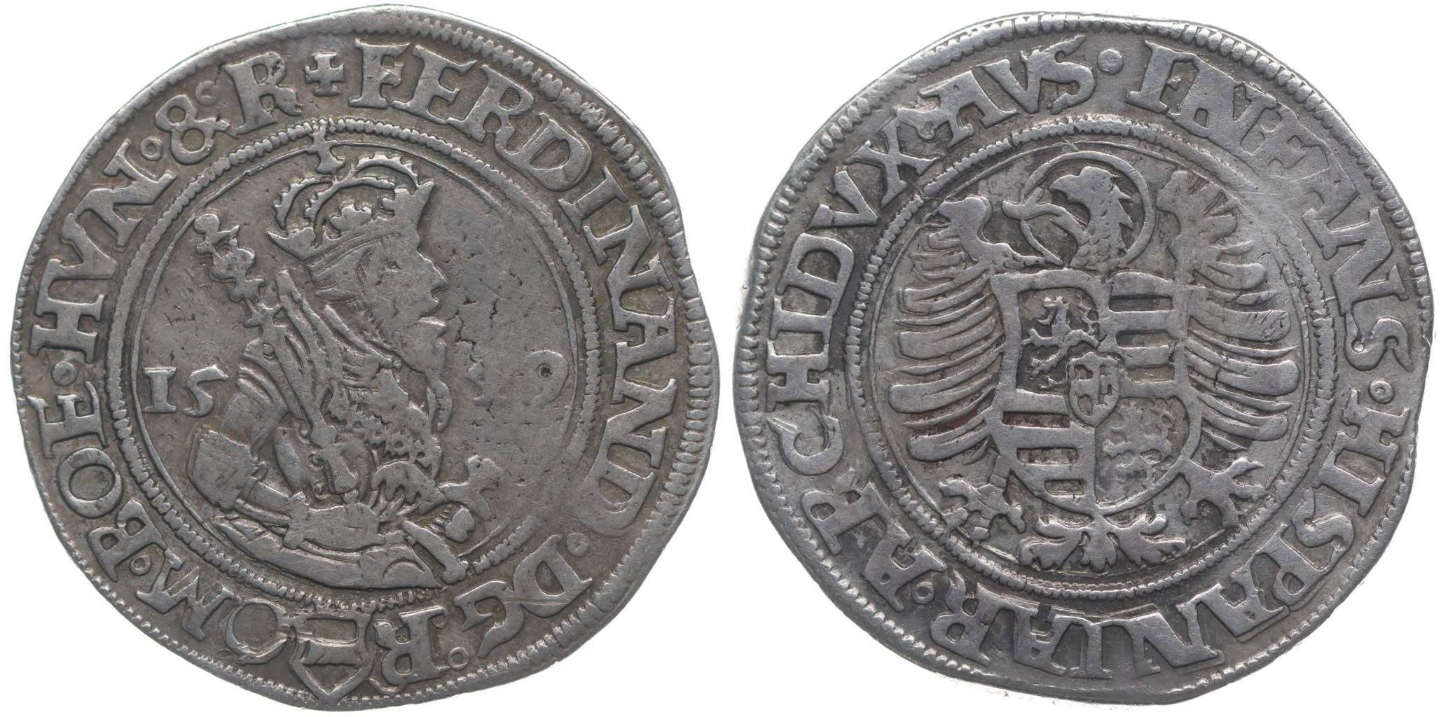 1/2 Tolar 1549, Jáchymov-Puellacher, J.35, MKČ.127, Do.1179, Ma.906 var. v opisu av.: místo "REX" je "R", v rev.: ARCHIDVX.AVS._č.ned.