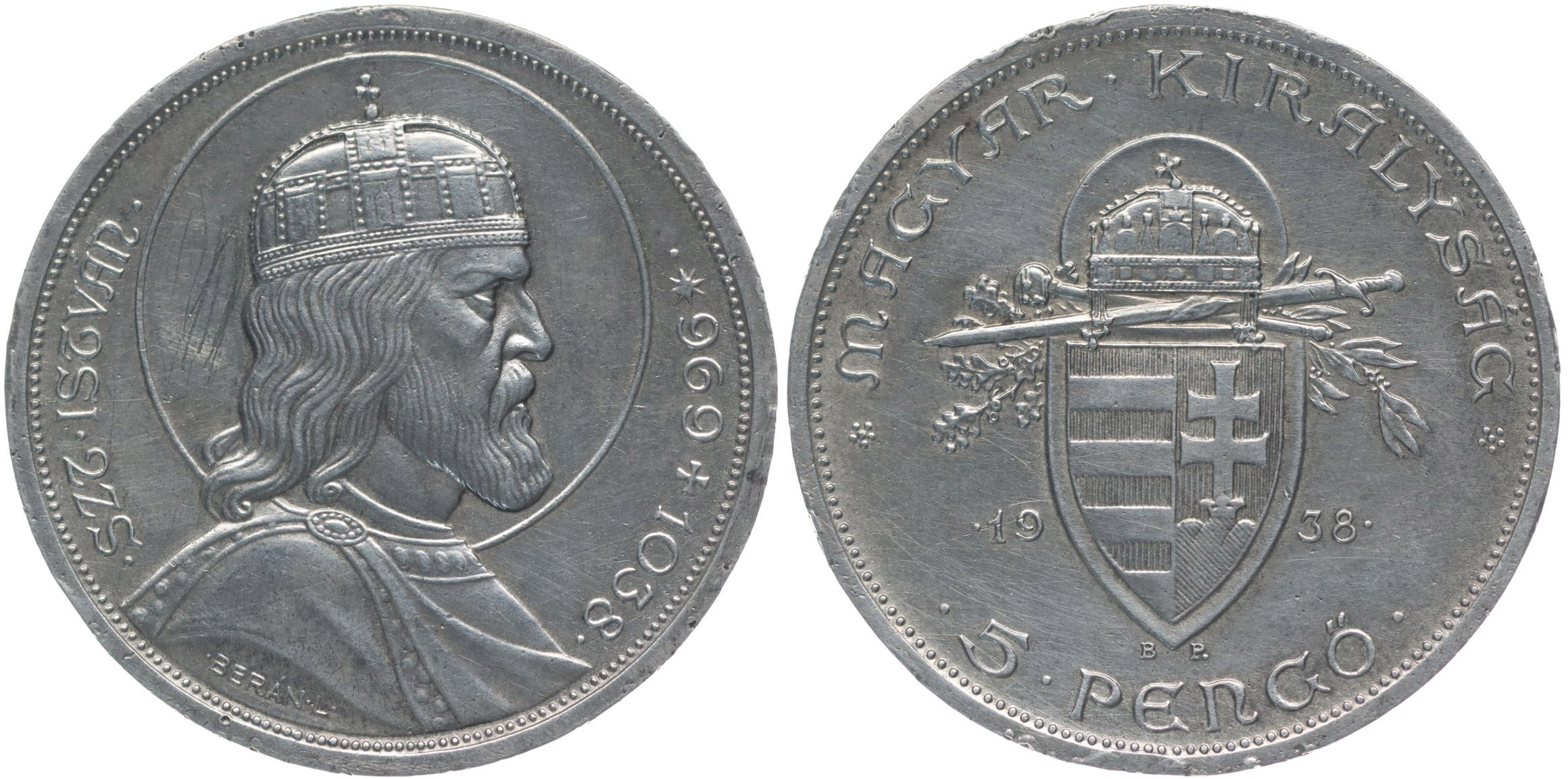 5 Pengö 1938 - sv.Štěpán, KM.516_dr.rysky v av.