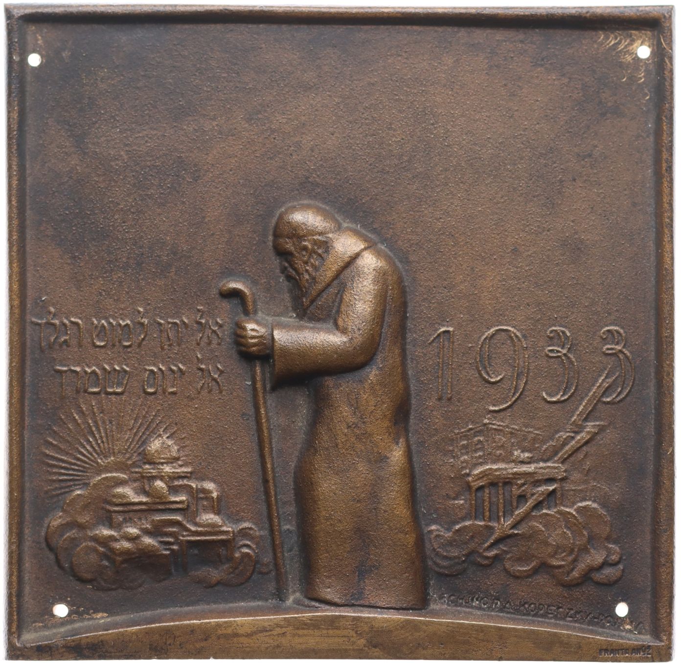 Postava starého rabína zleva, 1933, hebrejský nápis, blesk v budově, Sign., Litá bronz.plaketa 90x88 mm _4 dírky k uchycení jednostranná