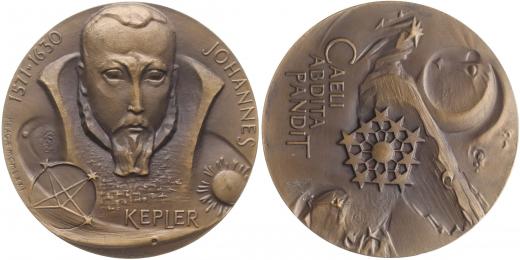 Jan Kepler - k 400.výr.narození 1571 - 1971 Poprsí čelně, nápis, opis / kosmické atributy, 3řádk.nápis Sign., Bronz 75 mm