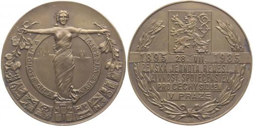 Zem. jednota řemesl. a živnost. společenstev pro Čechy sídlem v Praze 28.VII. 1895 - 1935, stojící ženská postava s rozepjatýma rukama, opis se atributy řemesel / český lev zleva, 5řádk.nápis ve věnci, Sign., Bronz 50 mm