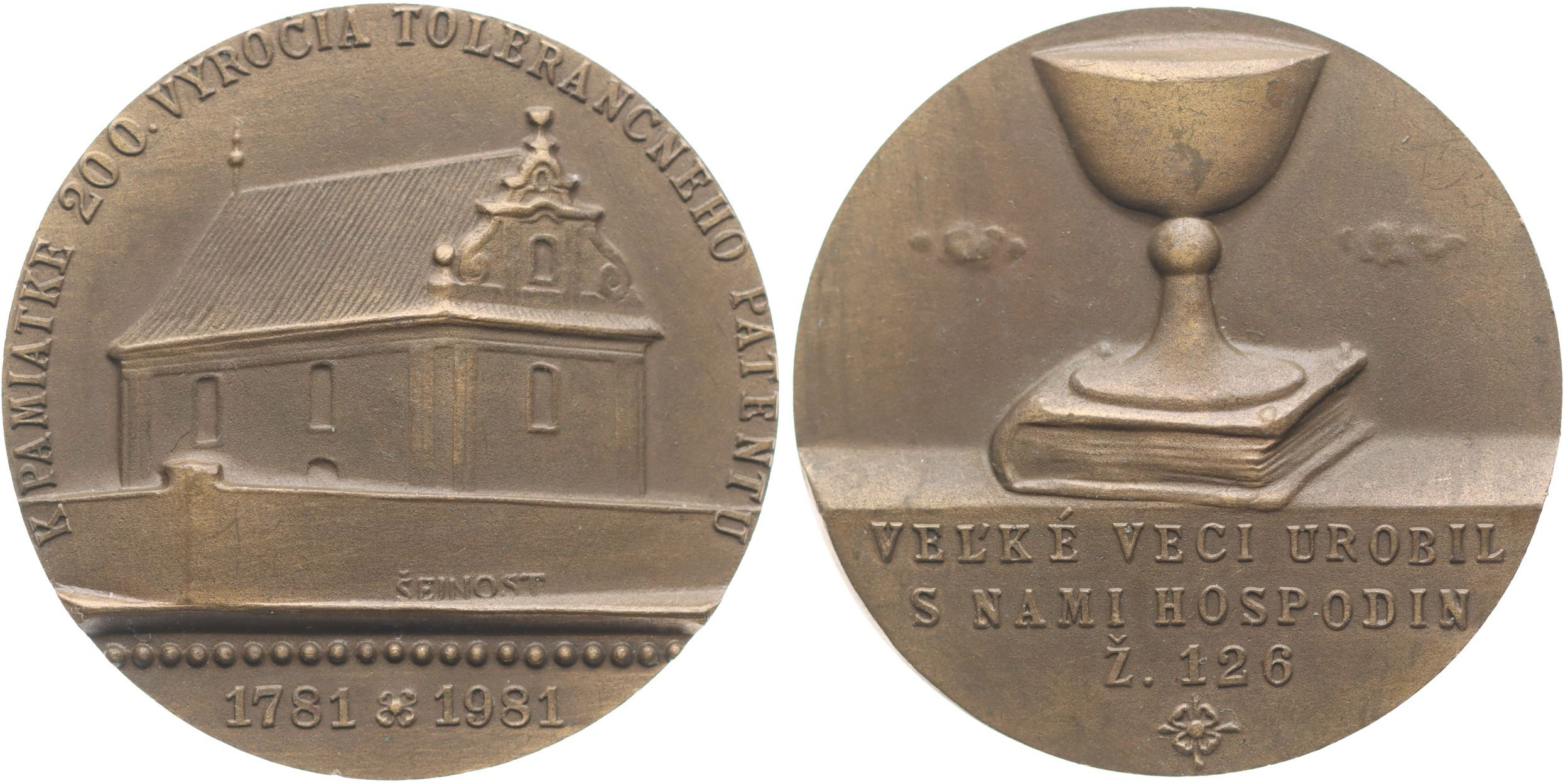 Na paměť 200.výročí tolerančního patentu, 1781 - 1981 Kaple, nápis a opis / kalich stojící na bibli, nápis Sign., Bronz 40 mm, 27,9 g