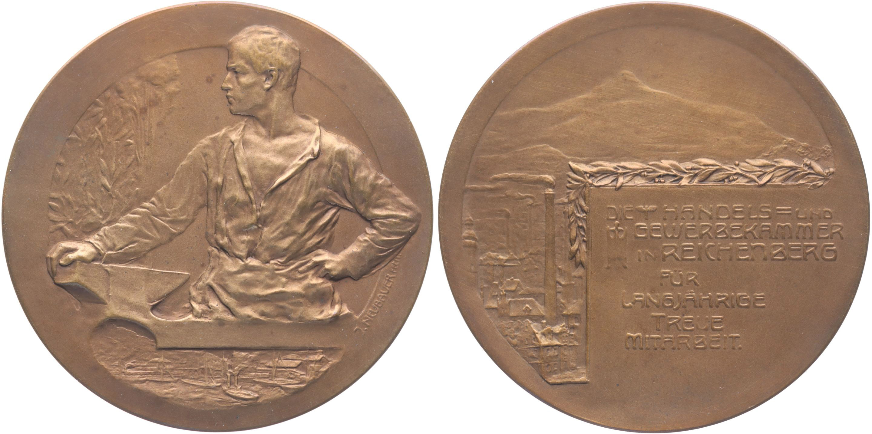 Neubauer - průmyslová a obchodní komora - za dlouholetou věrnou#Br spolupráci b.l. Mužská postava s kovadlinou / pohled na Ještěd 7řádk.něm.nápis, Sign., Bronz 60 mm, 71,20 g