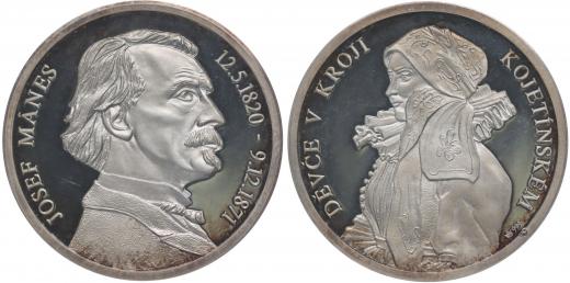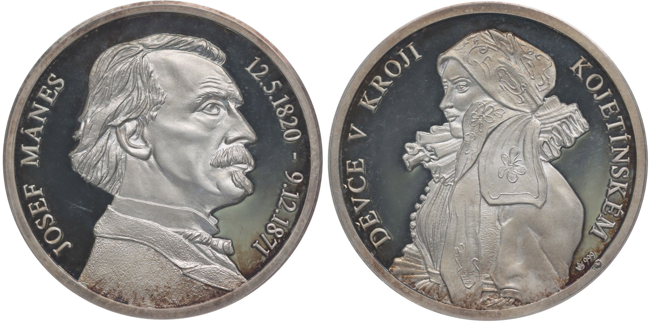 Nesign. - Josef Mánes (1820-1871) - děvče v kroji kojetínském, b.l. Poprsí zprava, opis / polopostava dívky zleva, opis, Punc.999, Ag 35 mm, 14,88 g_orig.etue