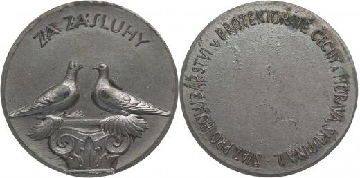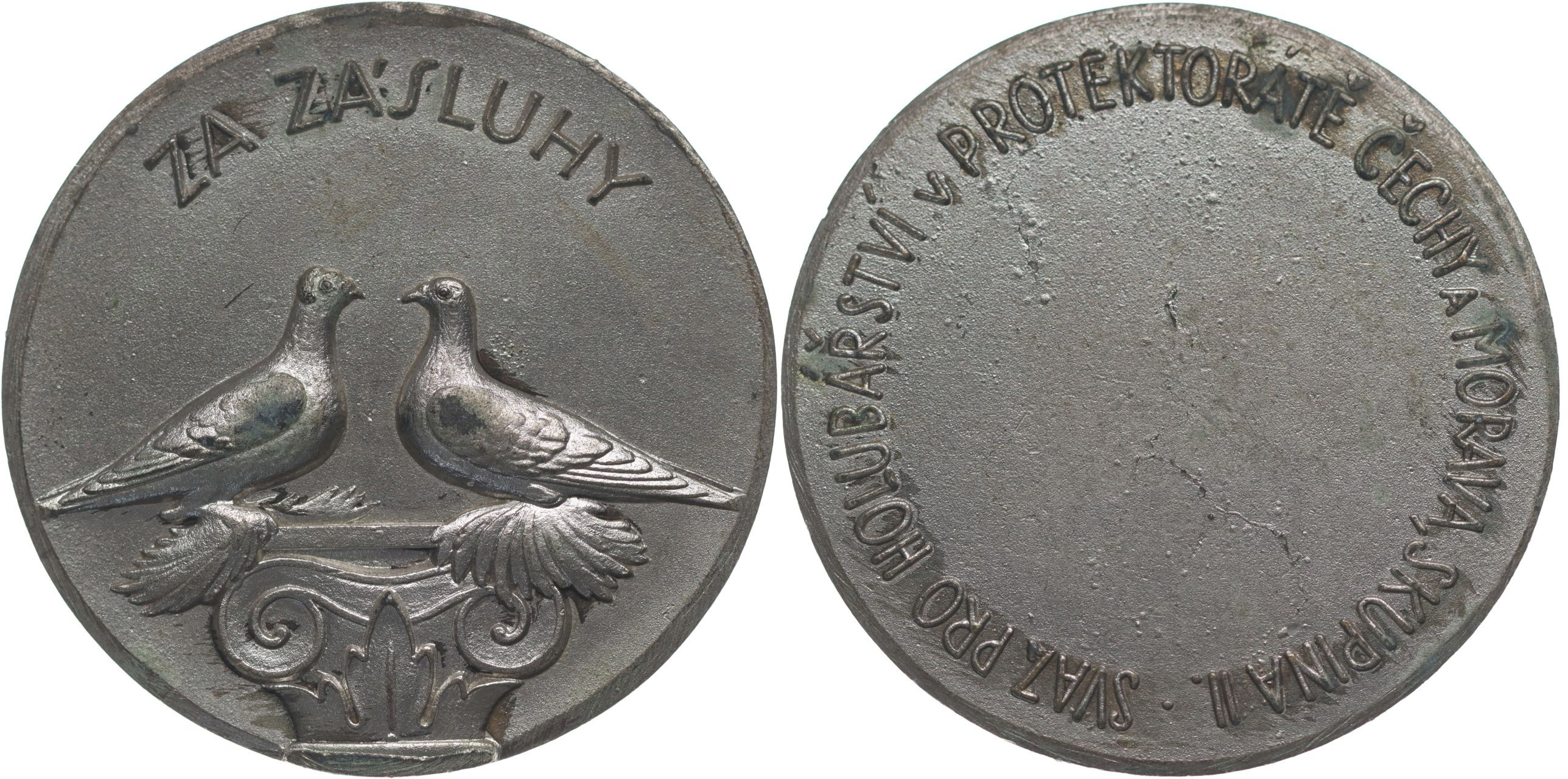 Svaz pro holubářství v Protektorátu Čechy a Morava, skupina II., b.l. Dva holubi na sloupu, opis Za zásluhy / prádzný střed, opis Nesign., Sn 40 mm, 20 g_R!