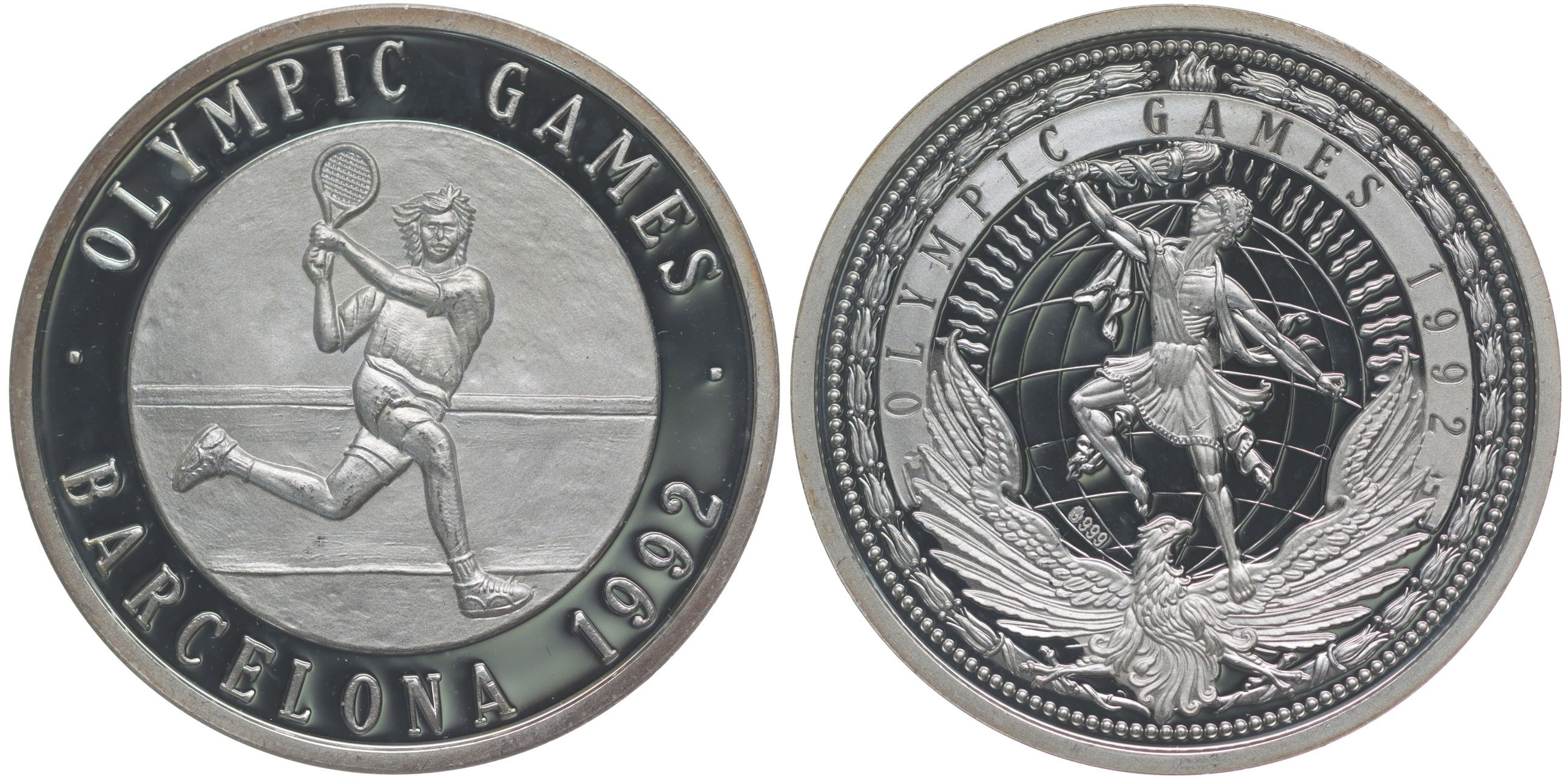 OH Barcelona 1992, tenista, opis / antický běžec s pochodní, opis Punc.999, Ag 40 mm, 20 g_orig.kapsle