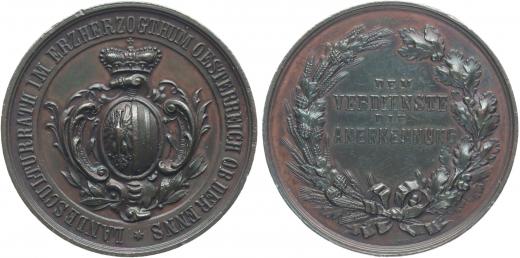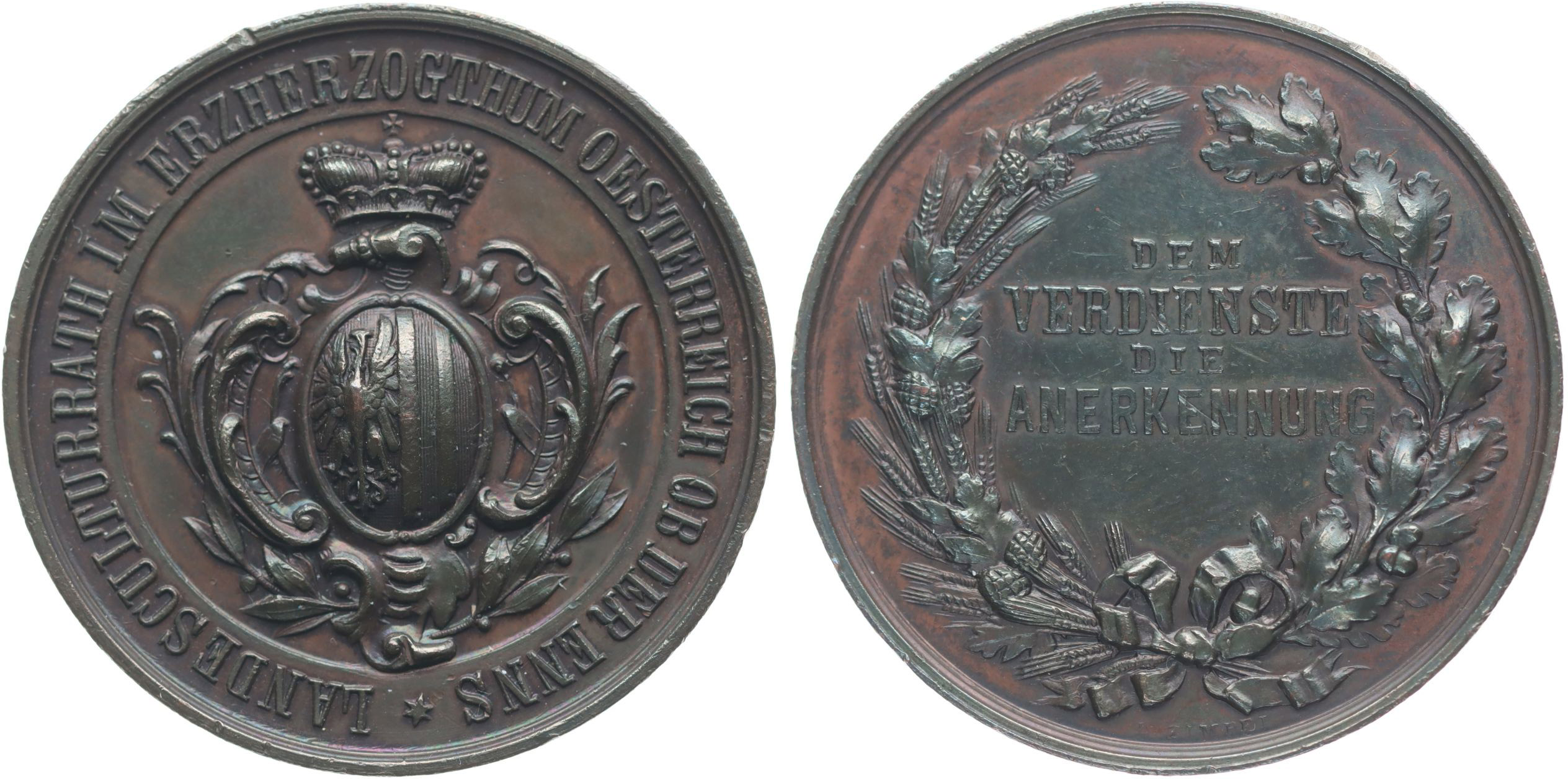 L.Zimpfl - Zemská kulturní rada arciv. Rakouského, b.l. pro město Enns - Za zásluhu a uznání korunovaný znak 4 řádk.nápis ve věnci, Sign., Bronz 40 mm