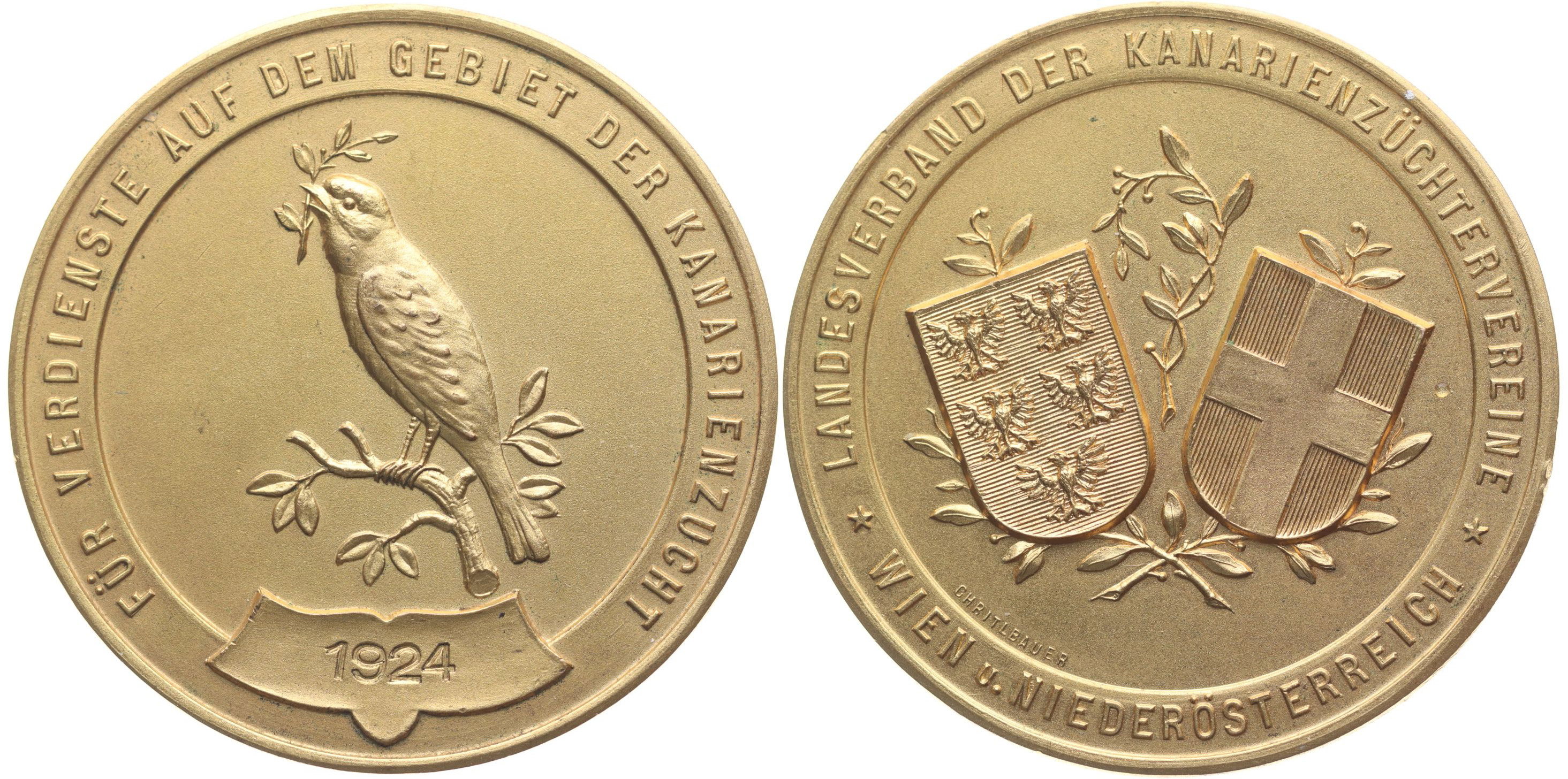 Vídeň - spolek chovatelů kanárů Vídeň a Dolní Rakousko 1924 Kanár na větvičce, opis / dva znaky, opis, Sign.Christlbauer Pozlac.bronz 45 mm
