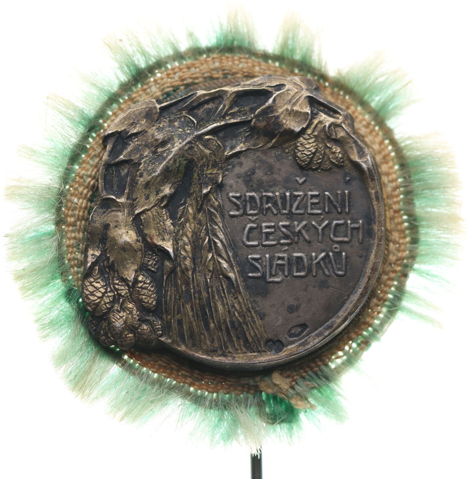 Sdružení českých sládků, b.l., atributy pro výrobu piva, 3řádk.nápis, 2x punc. Ag 33,5 mm_zelená rozeta s jehlou RR!
