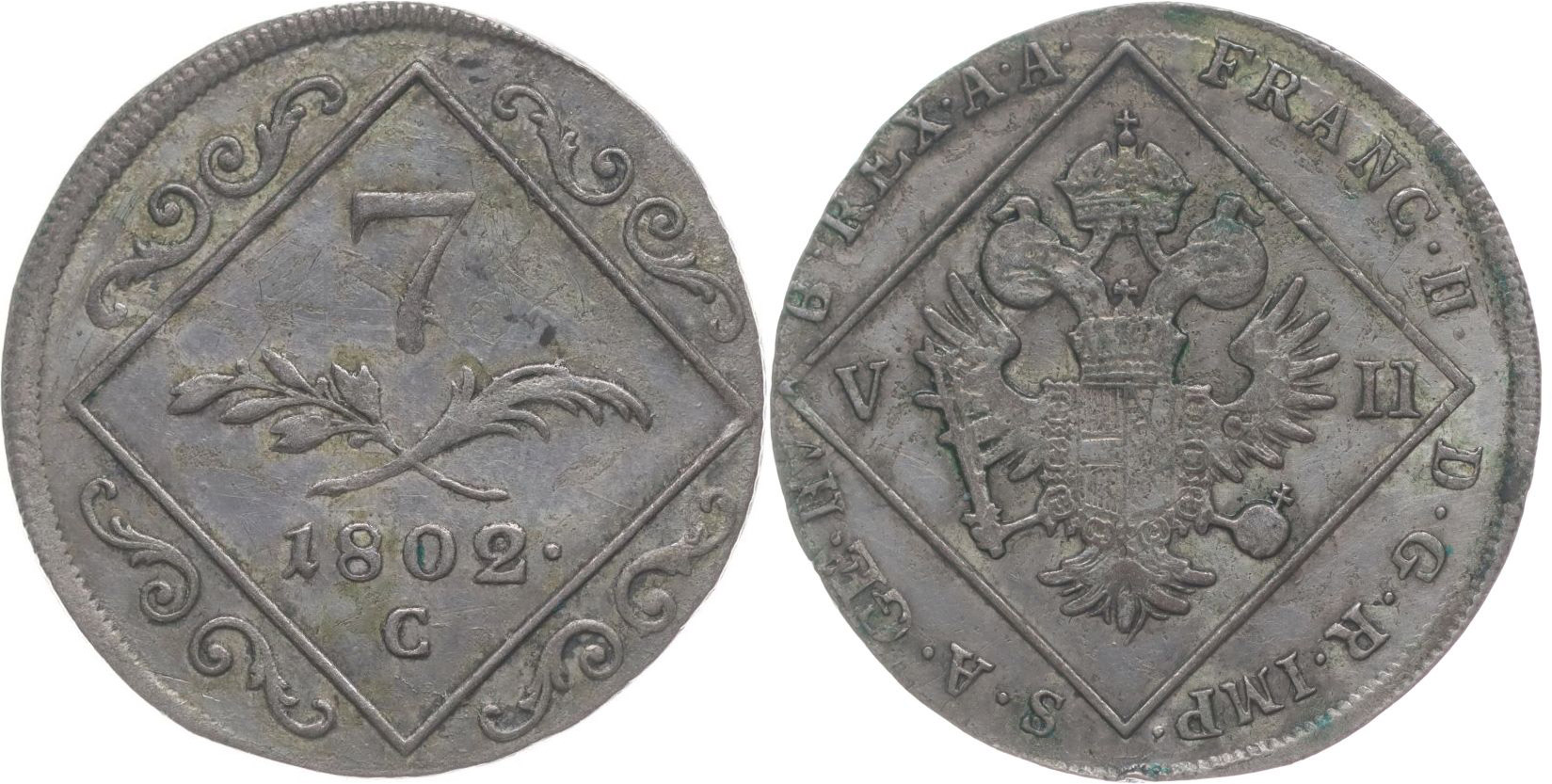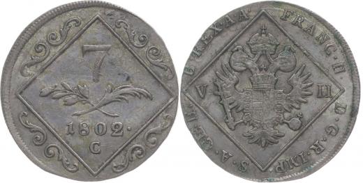 7 Krejcar 1802 C - dr.st. přeražby z 12 Krejcaru 1795