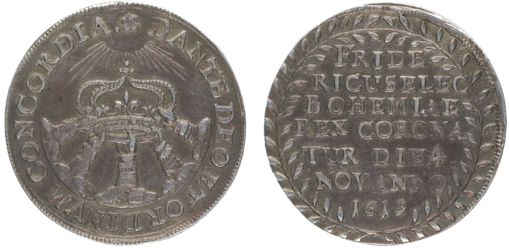 Velký peníz na volbu a korunovaci v Praze, 26.8. a 4.11.1619 Pět rukou drží korunu, sluneční paprsky, opis / 7řádk.nápis ve věnci, Ag 26 mm, 7,01 g, Nov.V/A-6a, Do.2045, Kil.2899_R!