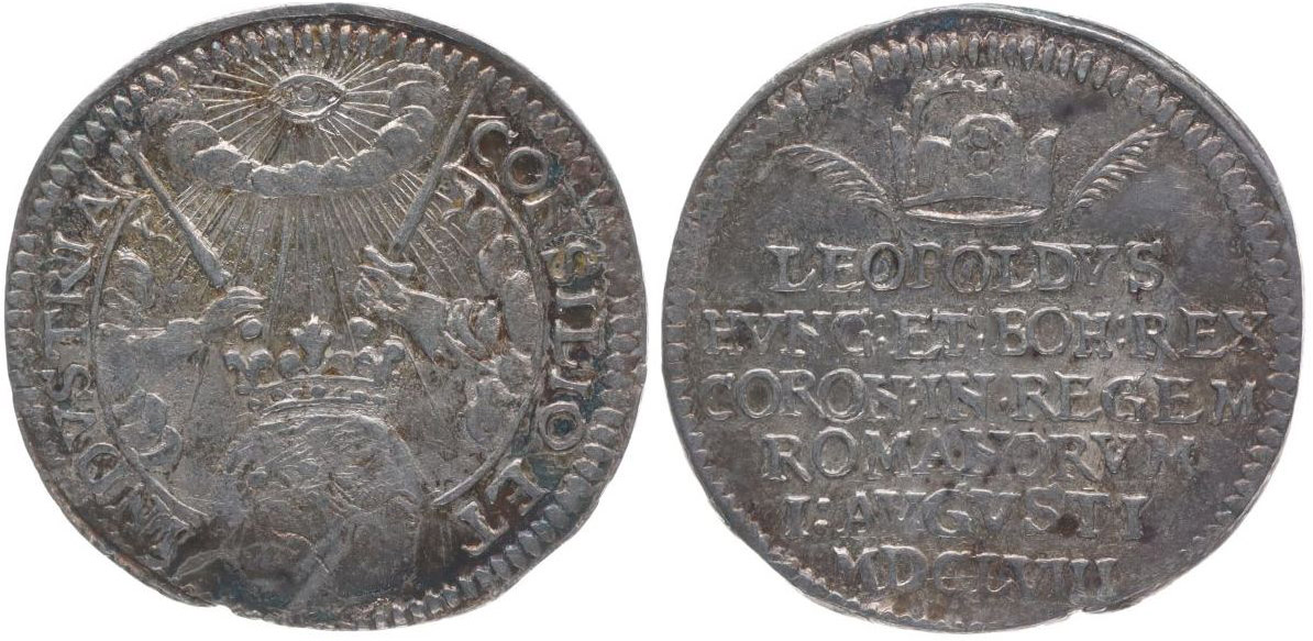 Malý žeton na císařskou korunovaci ve Frankfurtu, 1.8.1658 Koruna držená anděly, 6řádk.nápis / pod božím okem drží dvě ruce žezlo a meč, Ag 19 mm, 1,24 g, Nov.IX/E-13b, Mo.874, LG.II/488_R!