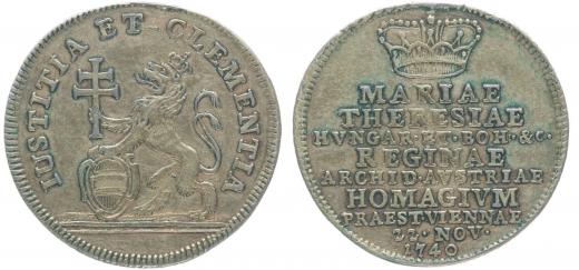 Větší peníz na holdování dolnorakouských stavů, 22.11.1740 ve Vídni Lev s křížem a znakem, opis / 9řádk.nápis pod korunou Ag 26 mm,3.55 g, Nov.XIII/B-1b, Ho.2839, Mo.1679