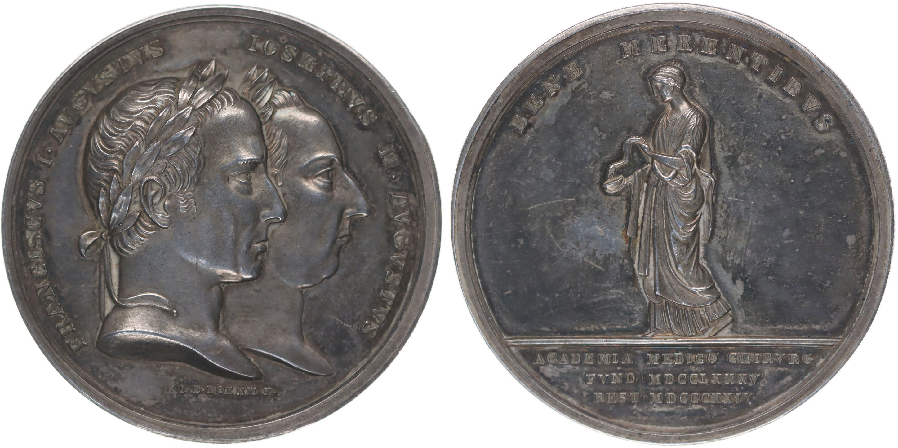 J.D.Boehm - prémiová medaile lékařsko-chirurgické akademie Josephinum ve Vídni v r. 1824, dvojportrét Josefa II. a Františka II. zprava, opis / stojící Hygie zleva, 3řádk.nápis v úseči, opis Sign., Ag 45 mm, 43,85 g, Mo.-, LG.XII/129, Ho.3466_R!