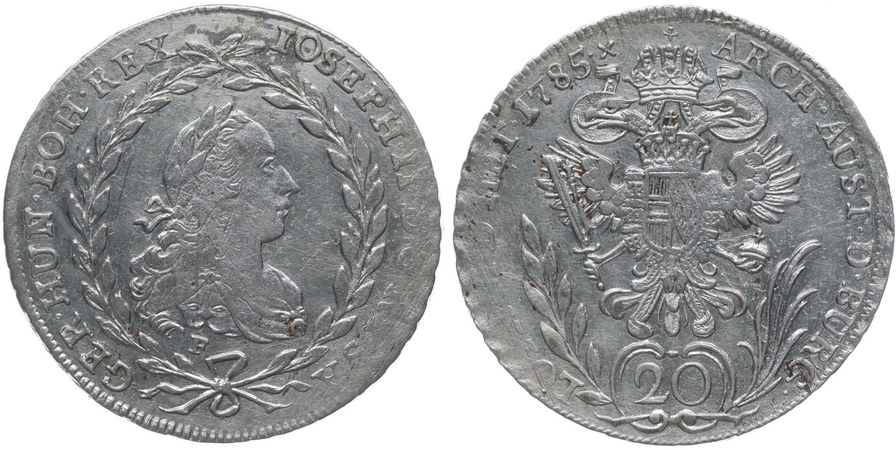 20 Krejcar 1785 F, P.31, Her.257_dr.rys. v av., dr.ned. v rev.