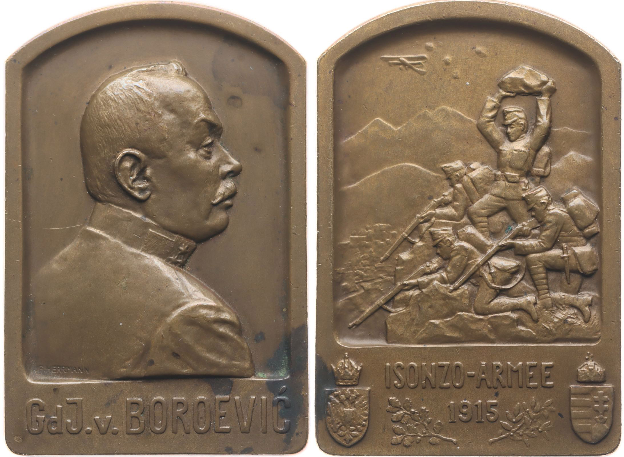 S.Boroevič - generál pěchoty ISONZO ARMEE 1915 Poprsí zprava, nápis / bitevní scéna, 2řádk.nápia mezi znaky Rakouska a Uher, Sign., Bronz.plaketa 47x70 mm, Haus.7234_R!