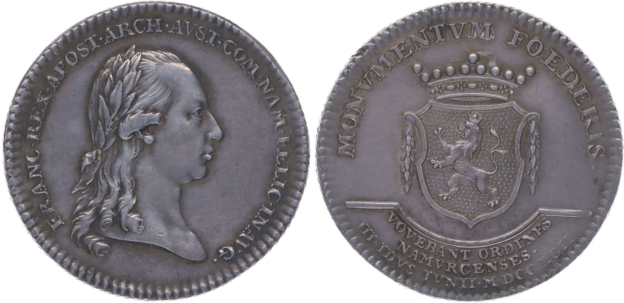 Medaile na holdování v Namuru, 1792#Ag Portrét zprava, opis / korunov.znak, opis, 3řádk.nápis v úseči Nesign., Ag 34 mm, 12,72 g, Nov.XVII/F-1b, Ho.3331_R!
