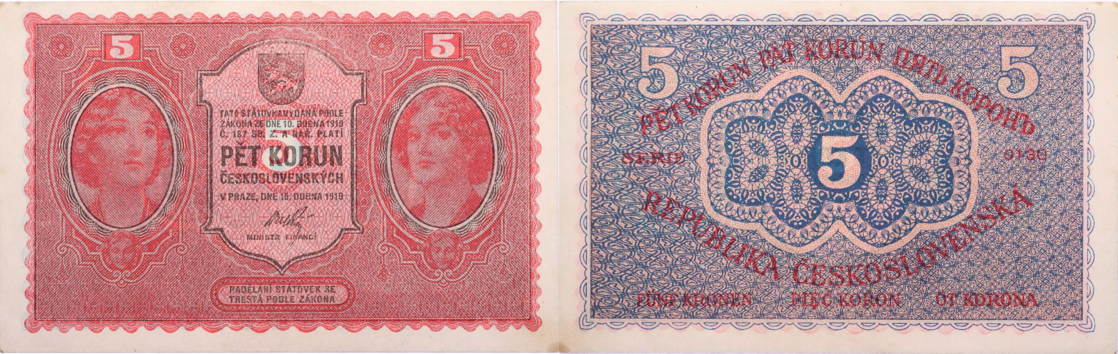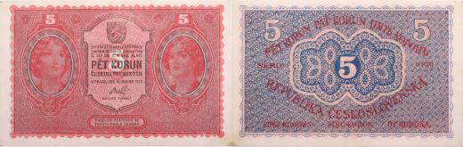 5 Kč 1919, série 0130, B.8, Hejzl.8a - dobový padělek - pravděpodobně typ 1_"neperf."