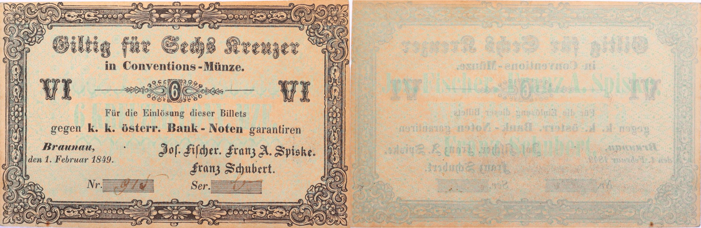 Broumov (Braunau), 6 Krejcar 1.2.1849, J.Fischer, F.A.Spiske, F.Schubert, čís.915, sér.2, bez podpisu a razítka, V-R.140.02.03