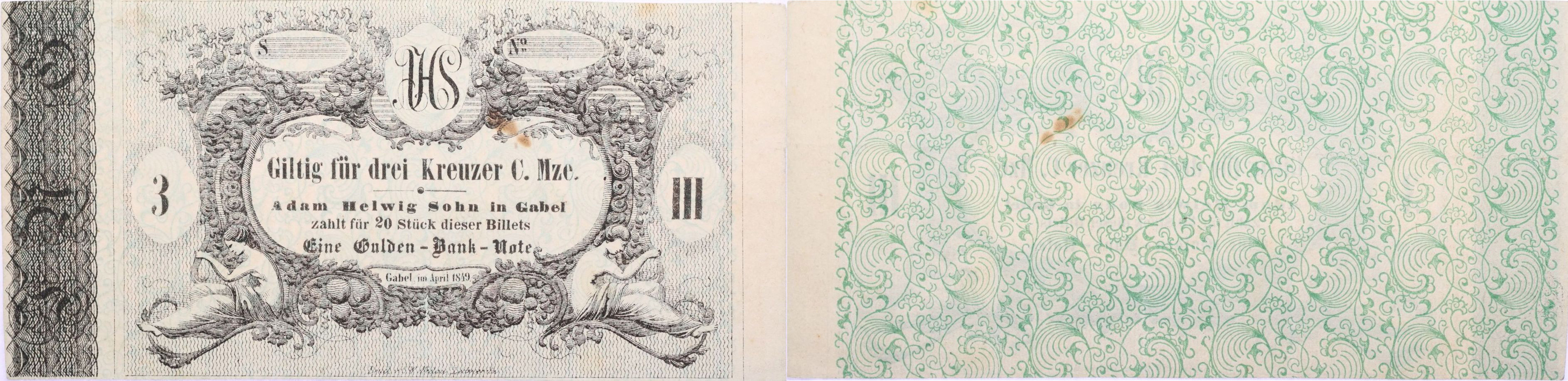 Jablonné v Podještědí (Gabel) - 3 Krejcar C.M. IV.1849 Adam Helwig Sohn, bez série a čísla, V-R.345.04.02_hnědá skvrna