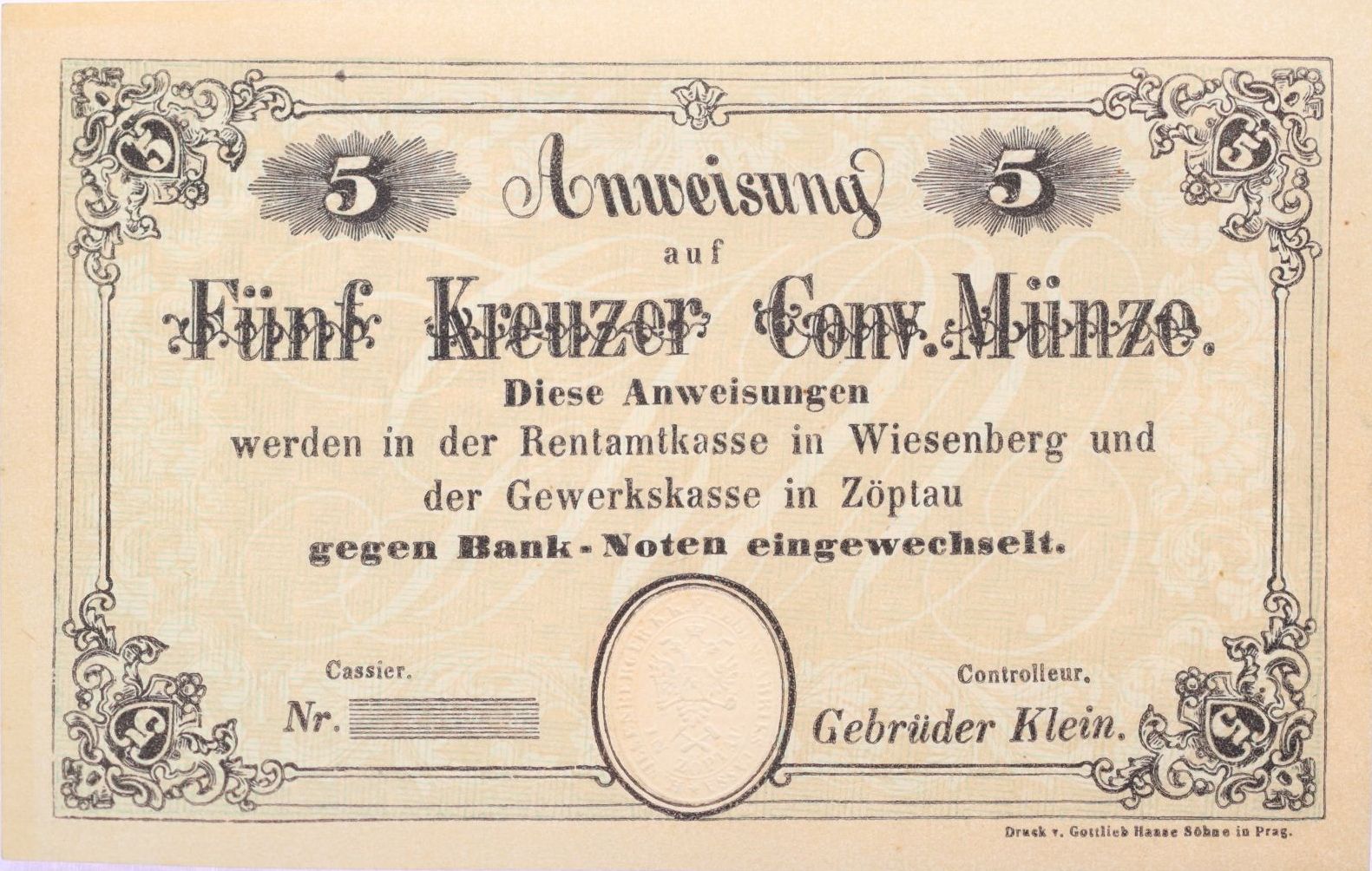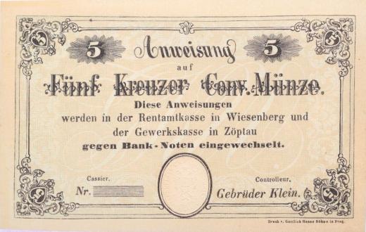 Loučná n.D. (Wiesenberg) a Sobotín (Zöptau) - 5 Kr.C.M. b.l. bratři Kleinové, bez čísla a podpisů, VR.1480.02.01.a