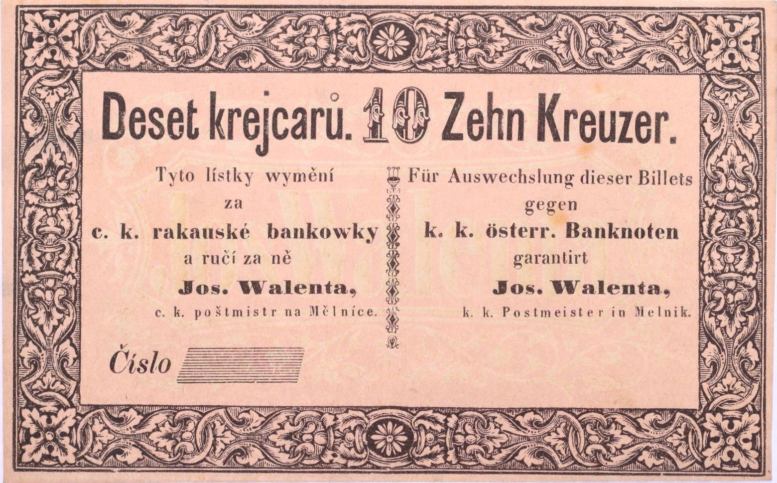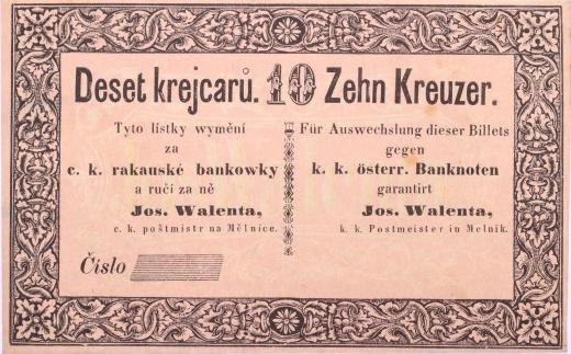 Mělník (Melnik) - 10 Kr.C.M., b.l., Jos.Walenta, c.k. poštmistr bez čísla a podpisu, V-R.840.26.03.II.b