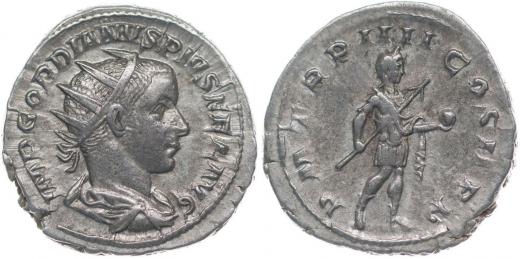 AR Antoninianus, Rv:"P.M.TR.P.IIII.COS.II.P.P.", císař stojící doprava s globem a kopím, K.72.37.2, S.2353, C.253