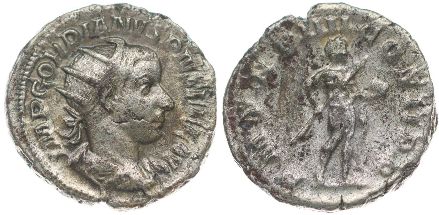 AR Antoninianus, Rv:"P.M.TR.P.III.COS.II.P.P.", stojící Gordianus zprava, K.72.37.2, S.2351pod., C.266pod, RIC.88