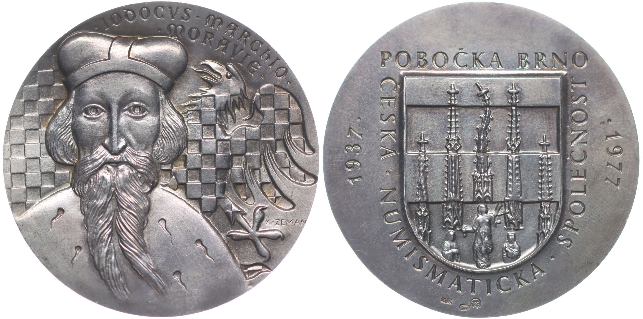 K.Zeman - 40 let pobočky, 1977#Ag Znak města s prvky gotické výzdoby radnice, opis / Jošt a moravská orlice, opis, Punc.900, Ag 42 mm, 23.6 g, BK.5/6, MF.A2/6a