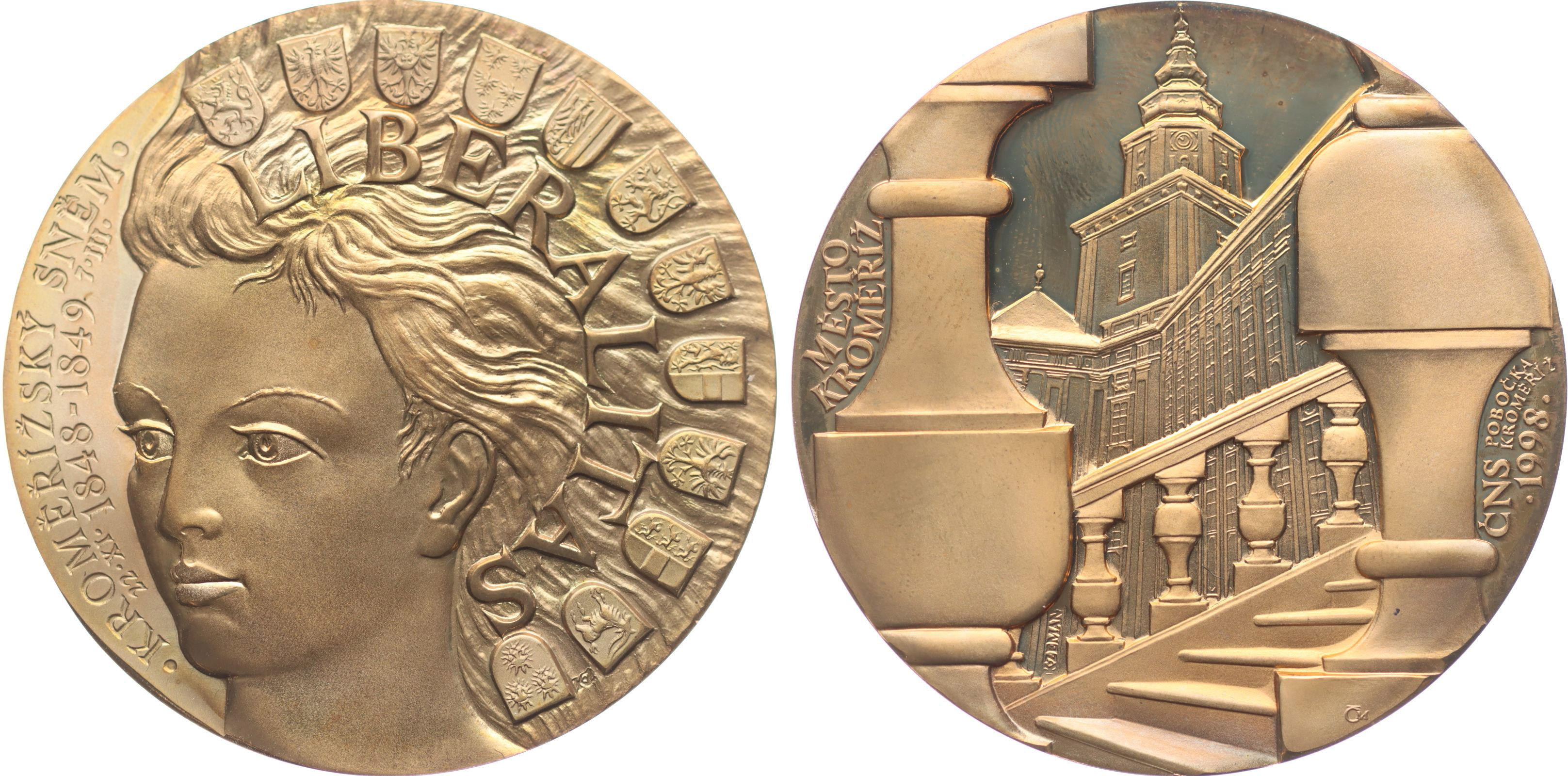 Zeman - 150.výročí kroměřížského sněmu 1848 - 1998#Br Portrét ženy mírně zleva, 12 znaků, opis / pohled na kroměřížský zámek, Sign., Bronz 50 mm, FM.A24/13, MF.A18/12b_orig.etue