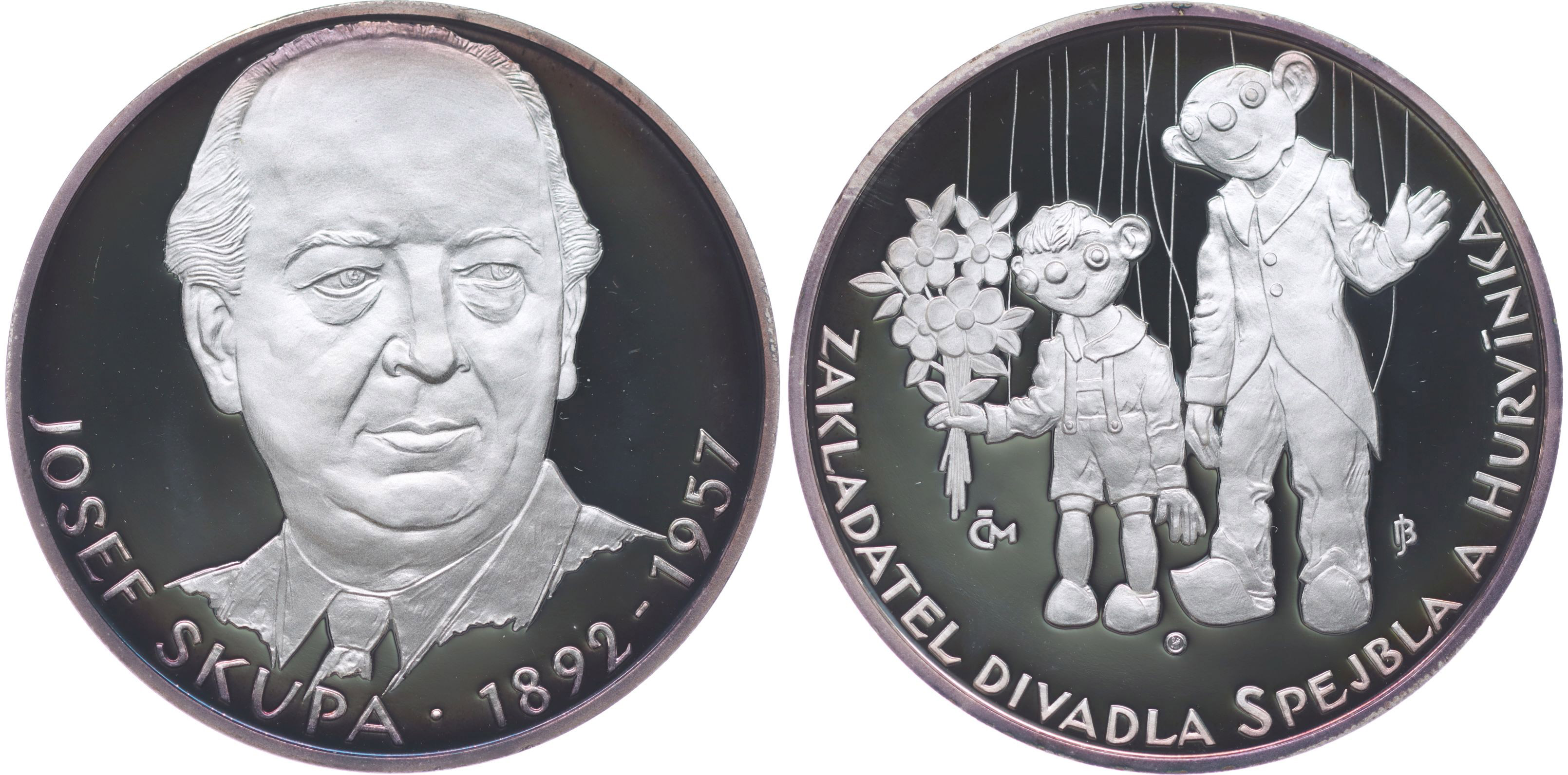 Josef Skupa (1892 - 1957) - zakladatel Divadla Spejbla a Hurvínka Poprsí čelně, opis / loutky Hurvínka a Spejbla, opis, b.l. (2007) Punc.999 Ag 50 mm, 42 g_orig. etue + kapsle + certifikát