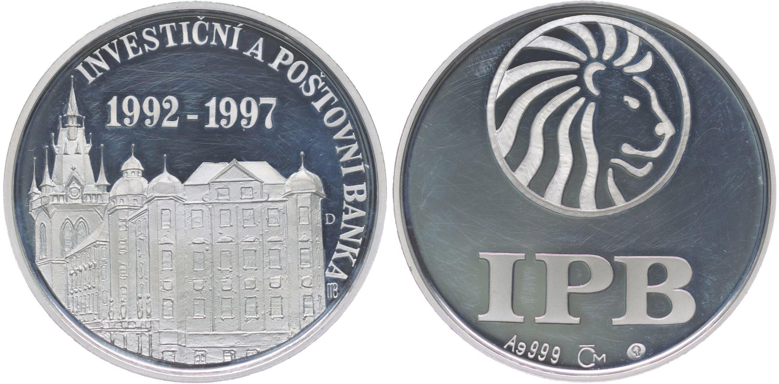 Investiční a poštovní banka 1992 - 1997 Znak banky, nápis / historické budovy, vročení, opis Punc.999, Ag 40 mm, 29,19 g_orig.kapsle + certifikát