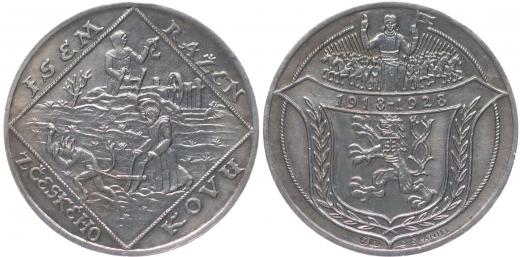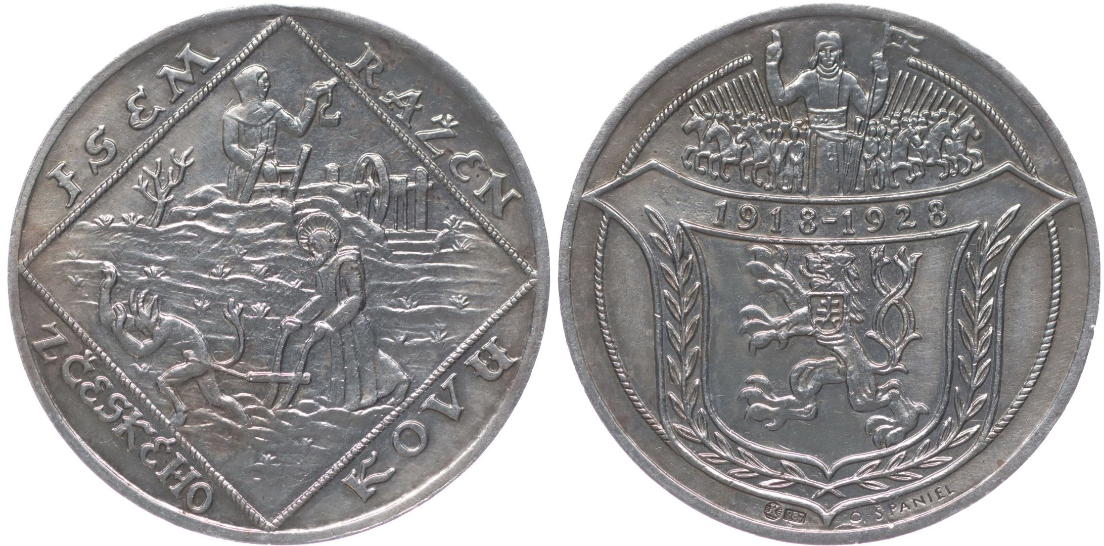 Jsem ražen z českého kovu - 10. výročí republiky 1928#Ag Sv.Prokop orá s čertem, havíř, opis / státní znak, Sv.Václav s rytíři, Sign., Punc.987, Ag 34 mm, 20.1 g
