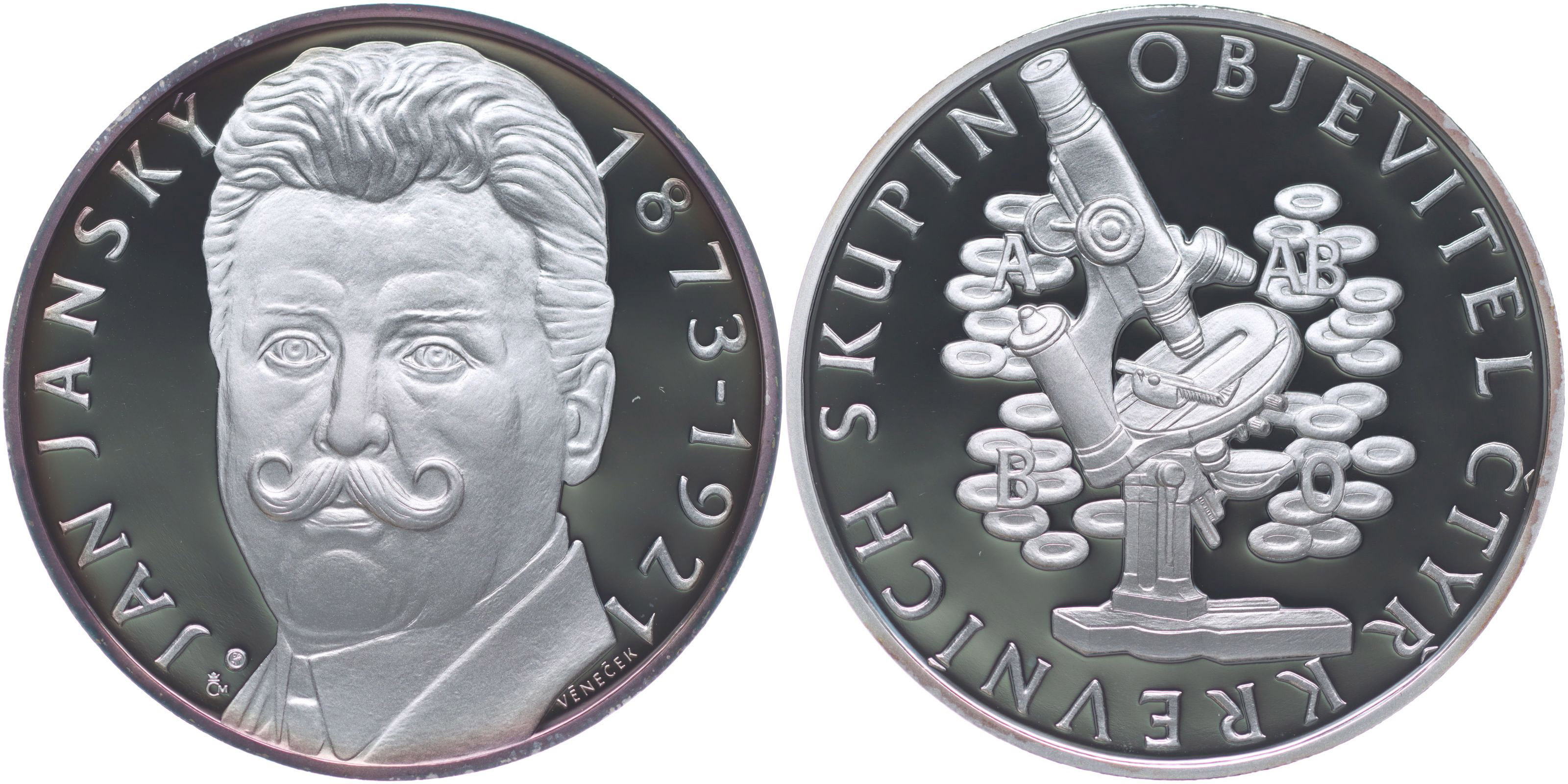 Jan Janský (1873-1921) - objevitel čtyř krevních skupin, b.l. (2011) Poprsí čelně, opis / mikroskop s buňkami, opis Punc.999 Ag 50 mm, 42 g, náklad 500 ks_orig.tue + kapsle + certifikát