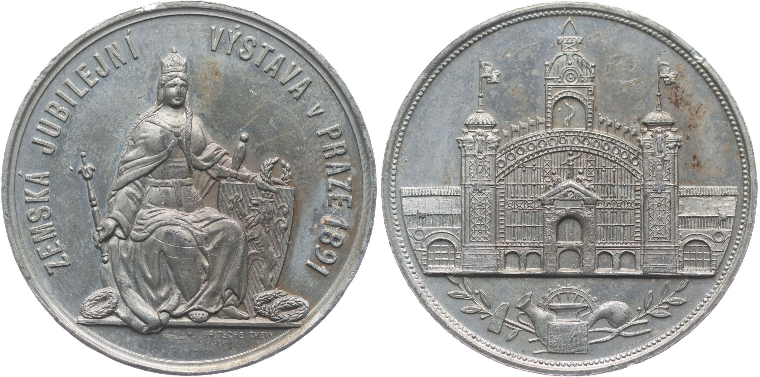 Německá upomínková medaile firmy Fritsche -Thein, 1891 Sedící Čechie čelně, opis / průmyslový palác, atributy průmyslu, Nesign., Sn 38,5 mm, bez ouška, ŠFP.29a