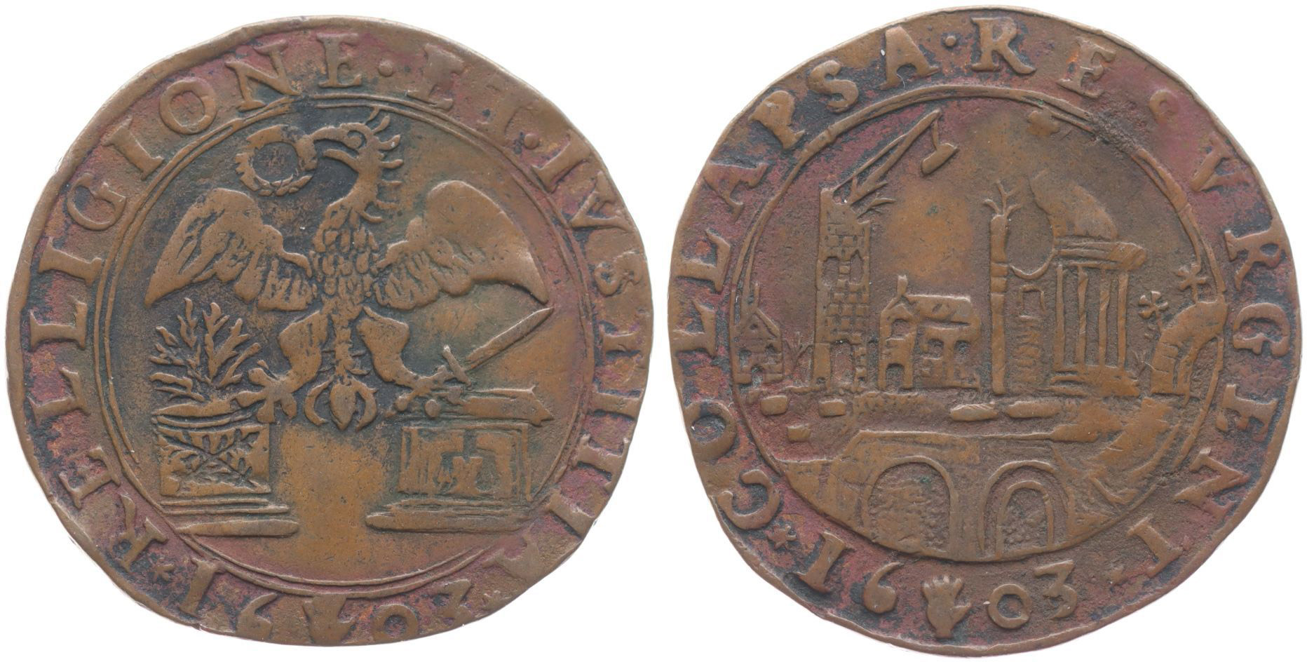 Nesign. - náboženství a spravedlnost, 1603 Orel s roztaženými křídly s věncem v zobáku, opis / zřícený hrad, opis Cu 30 mm, van Loon.II/7, Dugn.3554_R!