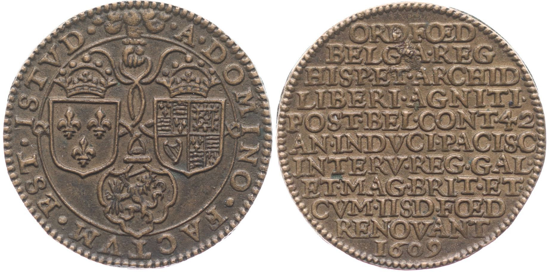 Nesign. - na spojenectví Anglie, Francie a Holandska 1609 Korunované znaky Anglie, Francie Holandska, opis / 11řádkový nápis, Cu 30 mm, van Loon.II/50, Dugn.3648_R!