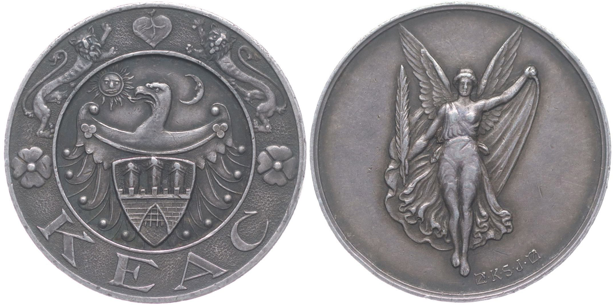 J.K.Sugar - KEAC - atletický klub, ve středu znak, opis / stojící anděl s palmovou ratolestí, b.l., Sign., Punc.890 na hr., Ag 33 mm, 17,13 g_R!