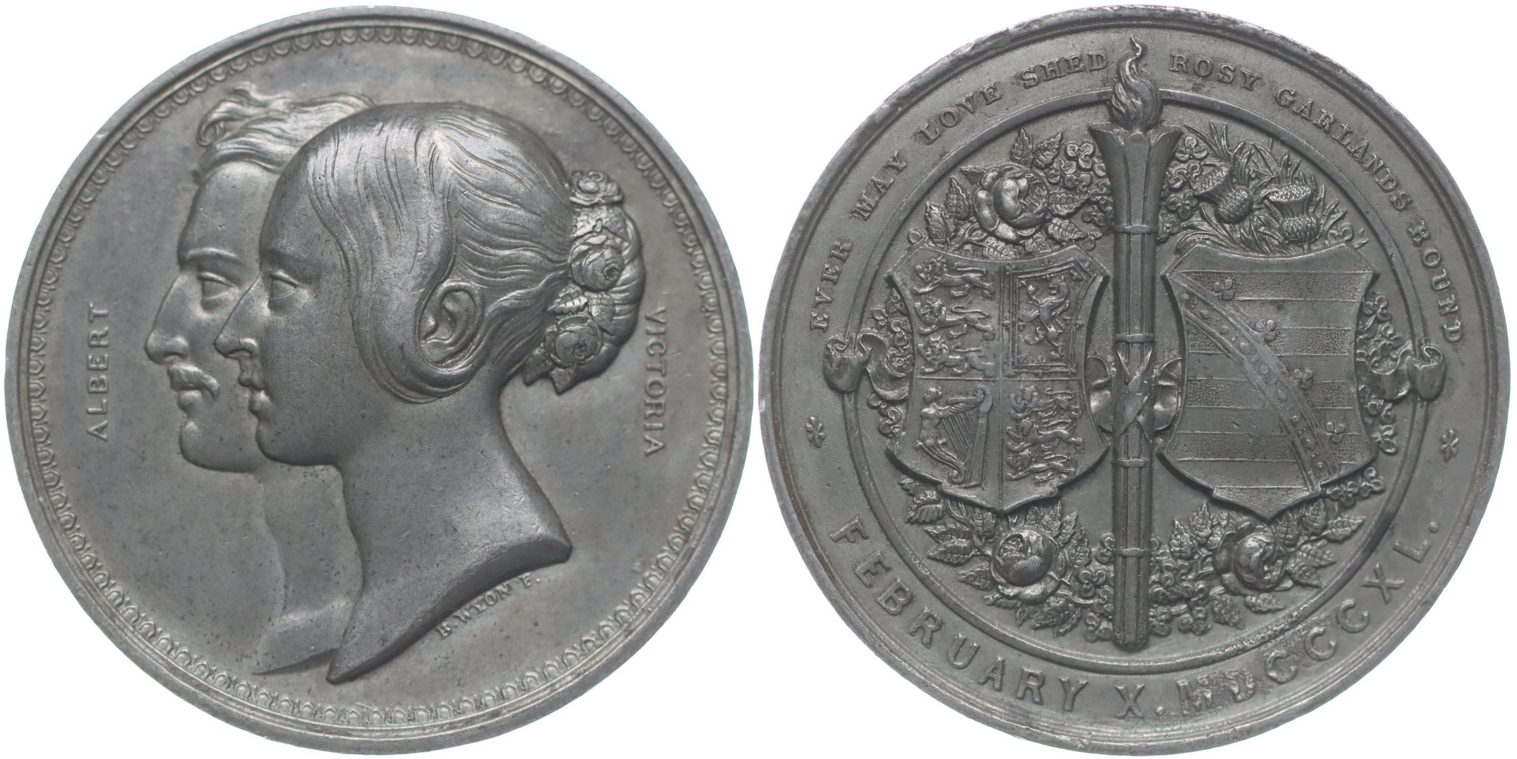 Victoria a Albert - svatební medaile X. February 1840 Dvojportrét královského páru zleva, opis / dnva znaky na věnci, překryté hořící pochodní, Sign.B.Wyon, Sn 46 mm, 36,01 g