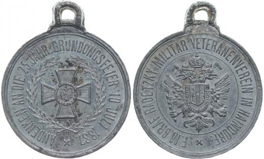 Hejnice (Haindorf) - veteran.spolek Radetzky - slavnost k 25.výročí spolku 10.7.1887, vojenský kříž ve věnci, opis / korunovaný rakouský znak, opis, Sn 27 mm_orig.raž.ouško