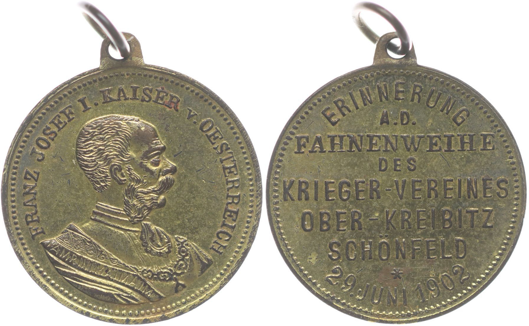 Hor.Chřibská (Ober Kreibitz) a Krásné Pole (Schönfeld) - na paměť svěcení praporu 29.6.1902, poprsí císaře zprava, opis / 6řádk.nápis, opis, Pozlac.bronz 28 mm_orig.raž.ouško se závěsem
