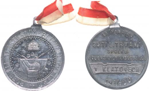 Klatovy - na památku 25 ti let trvání spolku 1.7.1900 korunov.vojenské atributy s praporem, bubnem a psíhlavou, český opis / 4řádk.český nápis, opis, Sign.Šmakal Praha, Sn 33,5 mm_orig.raž.ouško s bikolorou