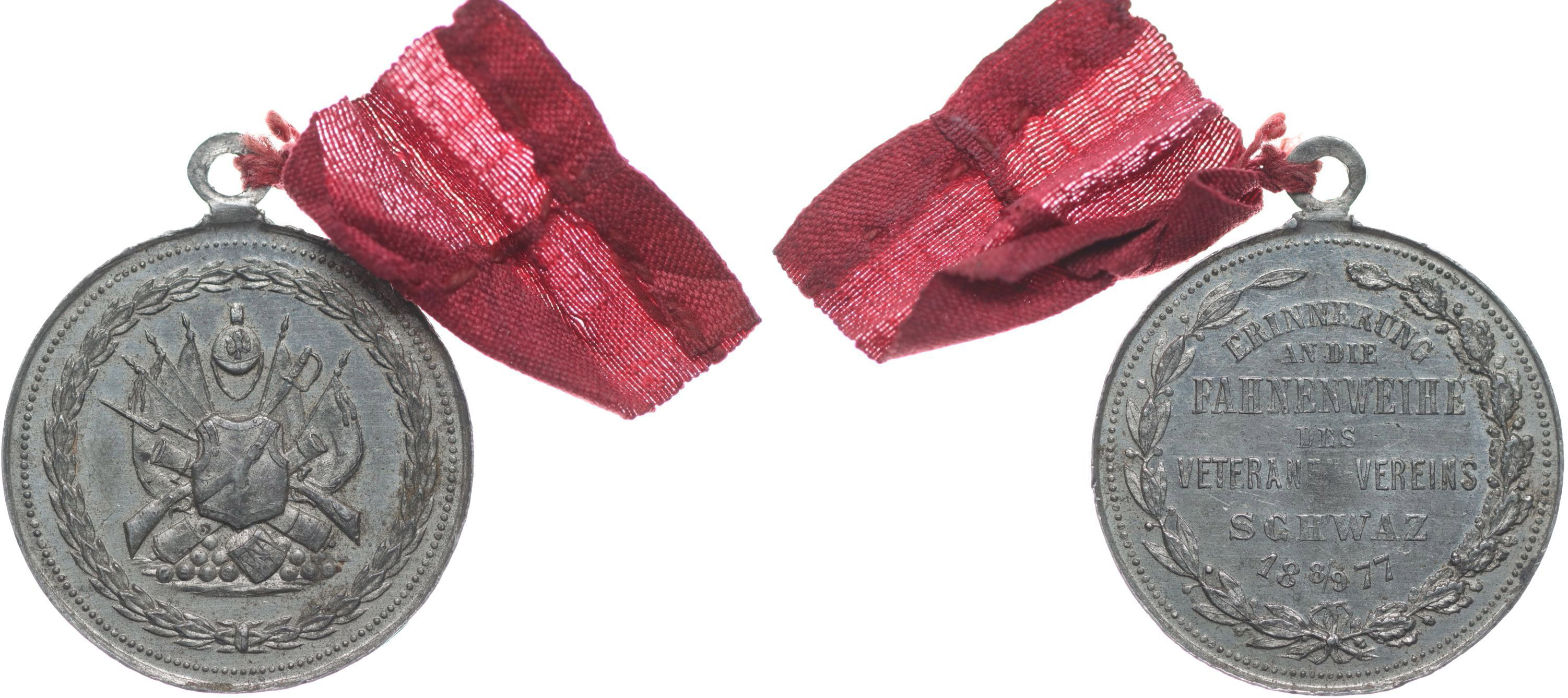 Schwaz (v Tyrolsku) - upomínka na svěcení praporu spolku veteránů 8.9.1877, vojenské atributy ve věnci / 7řádk.nápis ve věnci Sn 29 mm_orig.raž.ouško s červenou stužkou