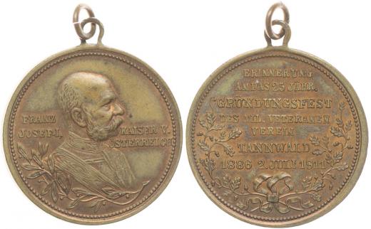 Tanvald (Tannwald) - upomínka na slavnost 25ti letého trvání spolku 2.7.1886 - 1911, poprsí císaře zprava, 2řádk.nápis / 7řádk.nápis ve věnci, Bronz 28 mm_orig.raž.ouško