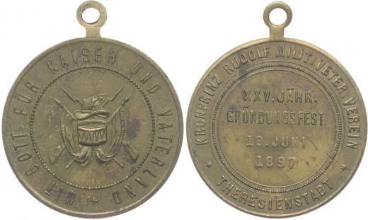 Terezín (Theresienstadt) - slavnost k XXV.výr. spolku korunního prince Rudolfa 18.7.1897, vojenské atributy, opis / 4řádk.nápis, opis Pozlac.bronz 31 mm_orig.raž.ouško