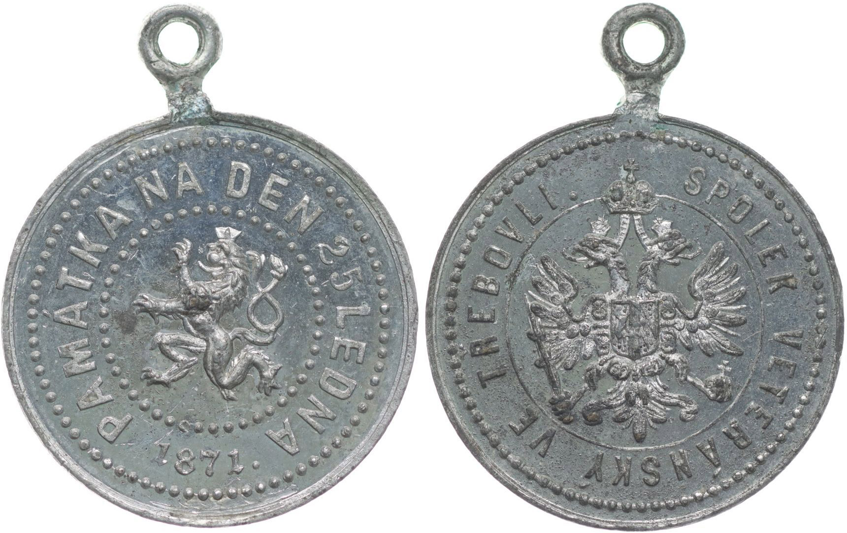 Třebovle - spolek veteránský - památka na den 25. ledna 1871, Korunov.český lev zleva, opis / rakouský znak, opis Sn 27 mm_orig.raž.ouško